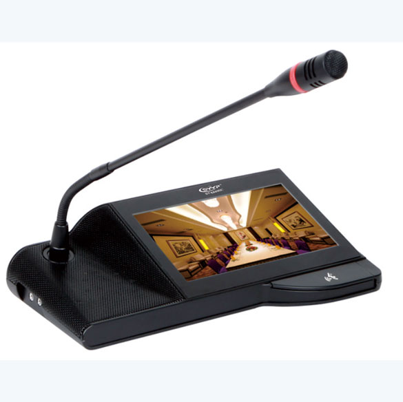 ■要發言時,按一下MIC ON/OFF鍵,此時燈環燈亮起;發言完畢, 再按一下MIC ON/OFF鍵,此時燈環燈滅。 ■所有發言設備都可通過系統設置菜單:調節本機的音量、LCD亮度。 ■麥克風具有發言開關可控制發言狀態。使用FPGA作為核心CPU。 ■具有強制切斷列席麥克風發言的優先功能,具有攝像機自動跟蹤功能。 ■臺面可移動式、可拔插咪管。 限制發言數量可選。 ■單元由系統主機供電。輸入電壓為DC24V,屬于安全范圍。 ■麥克風網頭具有環形紅色光環,可顯示麥克風發言狀態。 ■單元具有8P-DIN插座用于系統連接。 ■內置高保真揚聲器及外接耳機插孔。 ■可繞式電容麥克風,并配可更換式防風罩。 ■采用全新數控化設計。 ■可以發言與聆聽。 ■話筒桿具有加長型可供選擇。 ■麥克風具有發言開可控制發言狀態。 ■頻率響應: 80Hz~16kHz ■ 靈敏度: -44dB±2dB ■ 參考講話距離: 15cm~50cm ■咪桿長度: 390mm ■ 顯示屏:7” TFT 16:9 ■ 分辨率:800*480 ■色 彩:262K