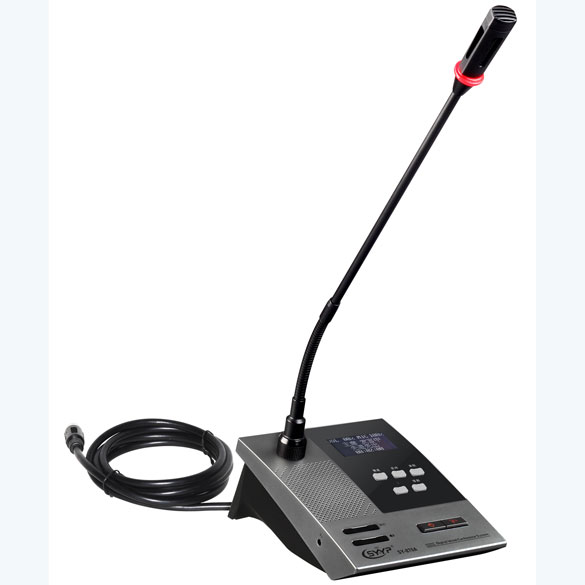 1、智能數字化設計控制電路,功耗低。 2、外置三鍵表決、電子簽到功能。 3、獨特的40CM長管,360度全方位旋轉設計,可拆卸;高保真單指向性電容咪芯,拾音距離遠、聲音還原度好、清晰度高、噪音小。 4、主席單元有優先發言權,可隨時關閉其他列席單元。 5、128X64LCD液晶,顯示單元身份、發言模式、發言狀態、發言時間。 6、優良抗手機干擾能力。 7、無噪音輕觸開關設計,操作靈活; 8、獨有音箱網外觀設計內置揚聲器,可用于會議擴音及播放會議背景音樂。 9、輕觸開關音量控制設計,可調節音量大小。 10、左側設計有3.5音頻輸出,收聽其他列席會議發言內容。 11、會議單元支持熱插拔功能,自帶2.1米8P連接線;手拉手連接模式,安裝簡便,操作靈活。 類型: 電容式 指向性: 單一指向性 頻率響應: 30Hz-18KHz 靈敏度: -43±2db@1KHz 輸入電壓: DC 9V(主機供電) 最小輸入阻抗: 1千歐 新噪比: 68 dB 輸入導線: 2.0M 8P屏蔽線 附件: 防風海綿、2.0M 8P T3M屏蔽線 SY-870B代表單元(下圖) SY-870B代表單元功能參數: 1、智能數字化設計控制電路,功耗低。 2、外置三鍵表決、電子簽到功能。 3、獨特的40CM長管,360度全方位旋轉設計,可拆卸;高保真單指向性電容咪芯,拾音距離遠、聲音還原度好、清晰度高、噪音小。 4、主席單元有優先發言權,可隨時關閉其他列席單元。 5、128X64LCD液晶,顯示單元身份、發言模式、發言狀態、發言時間。 6、優良抗手機干擾能力。 7、無噪音輕觸開關設計,操作靈活; 8、獨有音箱網外觀設計內置揚聲器,可用于會議擴音及播放會議背景音樂。 9、輕觸開關音量控制設計,可調節音量大小。 10、左側設計有3.5音頻輸出,收聽其他列席會議發言內容。 11、會議單元支持熱插拔功能,自帶2.1米8P連接線;手拉手連接模式,安裝簡便,操作靈活。 類型: 電容式 指向性: 單一指向性 頻率響應: 30Hz-18KHz 靈敏度: -43±2db@1KHz 輸入電壓: DC 9V(主機供電) 最小輸入阻抗: 1千歐 新噪比: 68 dB 輸入導線: 2.0M 8P屏蔽線 附件: 防風海綿、2.0M 8P T3M屏蔽線