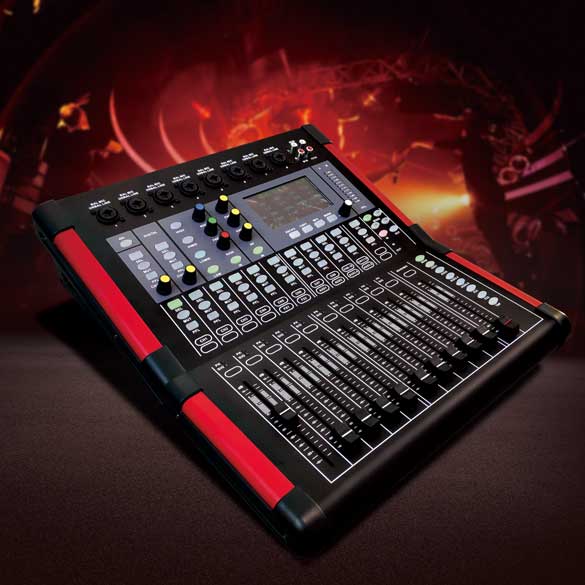 1:12路信號輸入(6路MIC、1組立體聲、1組返回、聲卡/MP3+光纖) 2:輸入處理 -輸入增益調節(電子增益)前級放大,高低通濾波,4段參數均衡,壓縮器,延時,輸入通道聲像平衡調節 3:MIC輸入采用數字增益調節 4:+48V幻象電源(MIC通道獨立打開關閉) 5:內置3個9段圖示均衡器(可任意插入1-6輸入通道) 6:輸入輸出EQ ON/OFF 7:立體聲返回輸入 8:通道參數快速拷貝功能 9:各通道設有多功能菜單,靜音按鍵,監聽按鍵 10:各通道均設有行程100MM電動推子,信號燈、峰值燈(9個推子) 11:8路信號輸出(立體聲主輸出,6路編組輸出) 12:輸出處理 -高低通濾波,13段參數均衡,壓縮器,延時,相位 13:輔助輸出(推子前,推子后) 14:多軌多模式數字錄音功能 15:雙排3色12段電平指示燈 16:內置聲卡(MP3、PC直接播放音樂) 17:4個快捷場景調用模式,12個場景存儲 18:用戶參數的存儲與調用(可在PC端管理) 19:內置雙DSP效果器 20:3.2寸400*240高清觸摸彩屏 21:FX踏板開關接口 22:光纖輸入輸出 23:多操作系統操控軟件(IOS系統, WINDOWS系統)中英文切換顯示 24:支持有線網口調節(或外接路由器無線調節) 25:參數鎖定功能