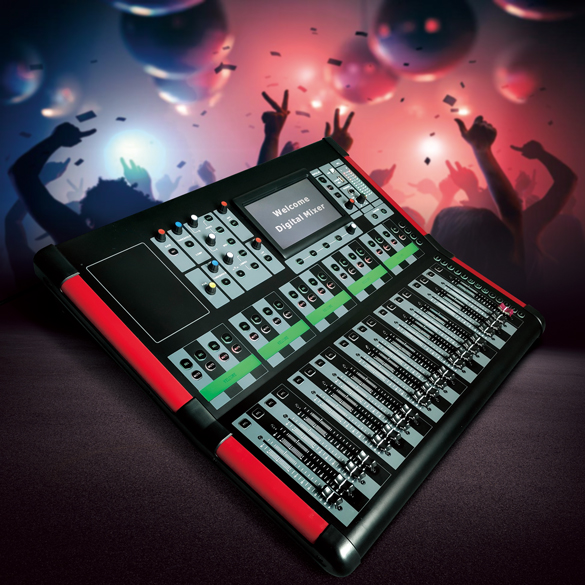 ??20路信號輸入(16路MIC輸入1組立體聲輸入) 數字輸入:光纖/聲卡,MP3 ??輸入通道聲像調節 ??MIC輸入增益調節(數字增益) ??+48V幻象電源(MIC通道均可獨立打開關閉) ??內置壓限器,高低通,5段參數均衡,延時,輸通道聲像平衡調節 ??通道參數快速拷貝功能 ??輸入輸出EQ ON/OFF ??多功能旋鈕 ??各通道均設有多功能菜單,啞音和監聽 ??通道均設有?程100MM電動推桿,信號、峰值燈(16個電動推子) ??10路信號輸出(主輸出L,R,8路AUX輸出) ??AUX輸出(推子前/后) ??輸出處理:高低通濾波,15段參數均衡,壓縮器,延時,相位 ??數字錄音功能 ??雙排3?色12段電平指示燈 ??內置聲卡(MP3、PC直接播放音樂) ??4個快捷場景調用模式,20個場景存儲 ??用戶參數的存儲與調取(可在pc端管理) ??內置雙DSP效果器 ??FX踏板開關接口 ??光纖輸入/輸出 ??多操作系統操控軟件(IOS系統, WINDOWS系統) ?? 支持有線網口調節(或外接路由器無線調節) ??7寸800*480電容觸摸顯示屏