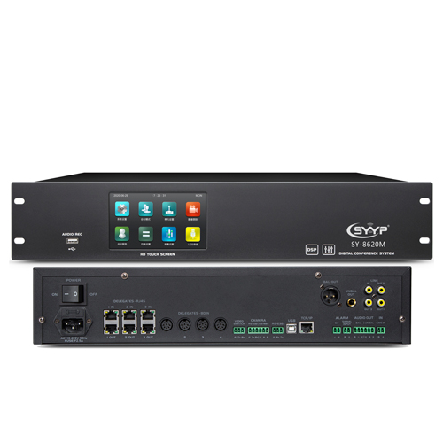 1.符合IEC60914、GBT15381-94國際標準 2.采用全數字會議技術,基于數字網絡架構開發,內置高性能CPU處理器,處理速度更快,音質更佳,支持討論、視像跟蹤功能 3.高性能開關電源供電,長距離傳輸對音質不會有任何影響 4.抗干擾電路設計,杜絕一切手機信號的干擾 5.★采用5寸全視角IPS電容觸摸屏,直觀顯示和方便調節系統的各項參數 6.★支持USB錄音,高保真WAV格式輸出 7.★具有3組共6路RJ45的話筒單元接口,采用閉環以太網鏈接模式,支持話筒單元的雙邊供電,且支持話筒單元熱插拔,每路支持20個單元,可接60個單元 8.★同時具有4路8芯話筒單元接口,每路支持30個單元,可接120個單元 9.★單臺主機通過擴展電源最多可接256臺會議單元,亦可通過會議擴展主機(多個擴展主機之間手拉手串聯連接),一套會議系統最多可接入達1200臺會議單元; 10.單元采用“手拉手”連接方式,支持熱插拔,方便安裝和維護 11.具有多種會議模式: FIFO(先進先出模式)、APPLY(申請模式)、FREE(自由模式)、LIMIT(限制模式)、VOICE(聲控模式) 12.發言人數限制功能:可以限定最多同時發言的單元數量(可設置為1-8不同數量),主席單元不受限制 13.發言時間限制功能:可以限定發言單元的發言時間(可設置0-1000S),并有定時關閉和自動關閉兩種模式,主席單元不受限制 14.★系統具備會議服務功能,發言單元可申請茶水、咖啡、紙、筆、服務人員等服務 15.★采用高性能DSP處理器對音頻進行32段均衡處理、降噪處理,使聲音清晰透徹;配合現場調整參數并有效的抑制嘯叫 16.★網絡化協作管理,系統主機可設置IP地址,具有TCP/IP網絡接口,可連接無線路由器,使用同一局域網內的電腦、手機、平板等設備對主機進行操作設置,支持蘋果iOS/谷歌Android/微軟Windows系統等操作系統 17.★具有USB接口,可連接電腦對主機進行操作設置 18.具有攝像頭232和485通訊接口(6P鳳凰插),連接標清或高清攝像頭,支持SONY VISCA、PELCO P/D通訊協議 19.具有視頻切換232接口(3P鳳凰插),可連接高清視頻矩陣 20.★具有4x1 HDMI高清視頻切換接口(選配) 21.具有中控代碼232接口(3P鳳凰插),可連接中控系統 22.具有1路平衡音頻輸出接口(3P鳳凰插),可連接擴聲或錄音設備 23.具有1路非平衡音頻輸出接口(3P鳳凰插),可連接擴聲或錄音設備 24.★具有1路DANTE音頻輸出接口,可連接其他DANTE設備(選配) 25.具有1路非平衡音頻輸入接口(2P鳳凰插),可輸入外部音頻信號(如:背景音樂或遠程語音信號) 26.★具有警報信號輸入接口(警報電壓接口+1路2P鳳凰插警報音頻輸入口),當公共廣播警報系統啟動時,可自動暫停會議,并向與會單元發送警報信息 27.可安裝于19英寸標準機柜上,易于存放和保管