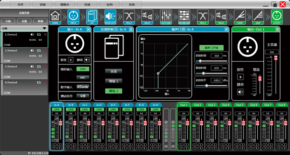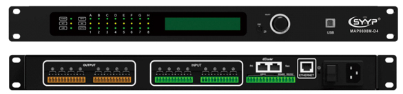 MAP0808M-D4是一款8進8出的自動混音媒體矩陣,配備8路模擬輸入和8路模擬輸出,內置反饋抑制,自動混音,矩陣混音,均衡器,分配器,壓縮器等DSP功能,支持Dante網絡音頻功能擴展,通過USB免驅連接電腦軟件控制,RS232,TCP/IP連接中控遠程控制,適合用在各種場合的擴音工程。 ■4路Dante網絡數字音頻輸入,4路Dante數字音頻經DSP處理后輸出 ■8路模擬音頻輸入8路模擬音頻輸出,支持麥克風輸入和線路輸入自由切換 ■Dante網絡數字音頻與模擬音頻可自由切換 ■每路輸入帶48V幻象電源,可以上位機軟件開關控制 ■模擬音頻每路輸入帶反饋抑制功能開關,兩檔調節 ■帶自動混音和矩陣混音功能 ■帶攝像跟蹤功能 ■輸入31段PEQ可調,輸出10段PEQ可調 ■USB免驅自動連接軟件,支持TCPIP多臺機器集中管理調試,配置RS232/RS485中控控制接口,GPIO外擴控制接口