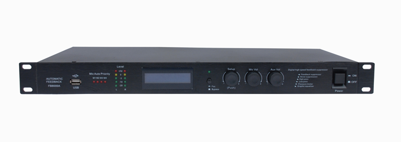 FB8000A:功能包含八路混音、反饋抑制、均衡、自動壓限、幻象電源,支持中控、 話筒部分可以任意切換錄音輸出; 一、產品功能特點: 1):2個通道音樂輸入,8路麥克風輸入。2X16藍色LCD屏顯示 2):本機內置48V幻象電源,后面板帶總幻象開關,(話筒1~4有四選一功能,話筒5/8直通話筒7/8 48V幻象電源自帶開關可以單獨選擇接無線麥克風) 3):本機具有高、低音調節和增益調整功能。 4):話筒自動四選一:在發言者講話時,可任意選擇其中一只或多只話筒開啟,離發言者遠的話筒將自動音量關閉,其作用是:a:減小外界環境噪聲經話筒傳送到揚聲器而產生的噪音,有利于會場的安靜和發言者語音的清晰度。b:減小由揚聲器發出的聲音二次傳入話筒形成正反饋而產生嘯叫的條件。 5):自動壓限器功能:本機帶自動自動壓限器,通過COMPRESS調整總輸出電平。在多話筒同時使用時, 可防止因整體系統的增益上升,而產生的回饋。 6):反饋抑制功能:采用自適應環境嘯叫抑制算法,內置24Bit A/D、D/A轉換;24位DSP處理器,48KHz高速采樣。采用高速浮點數字音頻處理器和先進的子帶(Sub-Band)回聲消除(Echo Cancellation)技術,可高速全自動完全消除嘯叫和回聲,同時讓現場音頻精準清晰實時送出. 可以通過“FSC/BYPASS”切換。 7):內置自適應動態噪聲濾波器,可濾掉現場環境的背景噪聲但不影響語音信號高質量的傳送。系統智能電平控制技術,可以獲的到清晰、持續的、信號電平無明顯波動的語音信號。內置AGC雙向控制,具有區分加強信號和輕柔信號的能力, 8):鍵盤上鎖功能:當管理員將設備調試完后,再將面板按鍵鎖住,防止非管理員進行操作。 9):全自動化操作的工作方式,免人工調試,無論房間環境中位置、溫度、濕度、 裝飾的改變,系統安裝都無需進行聲場調試,精準可靠使用簡單。 10):內置10段圖示均衡器:輔助調節音色和反饋嘯叫點. 11):8路切換話筒錄音輸出切換開關,開關OF時該路話筒沒有輸出. 12):本機帶平衡輸出和一組輔助錄音輸出。 13):各自適應反饋抑制功能可通過本機USB連接電腦設置.支持中控調節