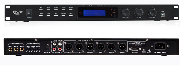 5.1數字機 此系列產品是具有音箱處理器功能的卡拉OK效果器,每部分功能都獨立可調; 采用先進的24BIT數據總線和32BIT DSP架構; 音樂輸入通道設有7段參量均衡; 麥克風輸入通道設有15段參量均衡; 主輸出設有5段參量均衡; 中置、后置和超低輸出均設有3段參量均衡; 麥克風設3級反饋抑制器,可選擇開/關; 可預先儲存16種模式; 所有輸出通道均設有壓限器、延時器; 內設管理者模式和用戶模式; 擁有完美的PC端軟件,非常直觀的均衡器曲線圖 超強防沖擊電路設計,更好的保護您的設備。