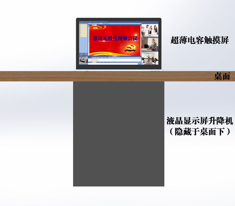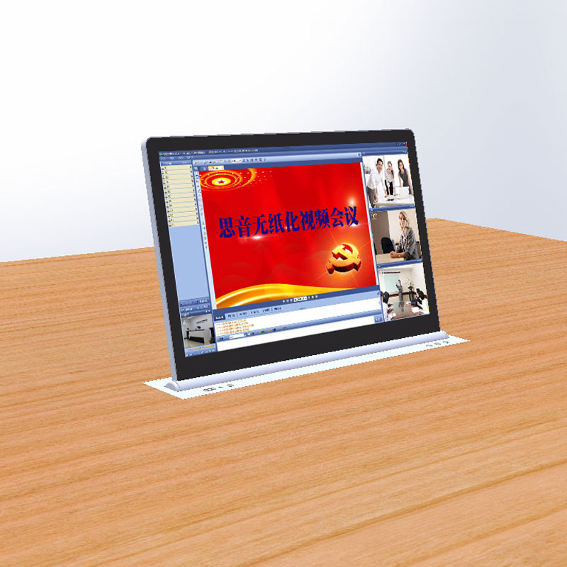 產品本身內置LED顯示屏,超薄機身和鋁合金精拉絲氧化面板結構,齒合式直線導軌傳動方式,機械防夾手設計,一體化機身防護,外觀無螺絲,產品使用安全可靠,美觀大方。外置VGA、DVI、HDMI等多重信號接口和RS232/485控制接口,產品在啟動時,液晶顯示屏升降器從箱體內部升出桌面并自動為顯示屏供電,產品設有智能仰角0-15°可調節角度功能,滿足各個人群的顯示屏仰角使用需要。當產品使用完成需要關閉時,顯示屏自動返回升降隱藏于箱體內部并自動斷開顯示屏電源,起到保護顯示屏并節約用電的作用。產品具有防盜、防塵、和保持桌面平整清潔,會議場所整齊有序等功能。本系列產品可按客戶要求定制。