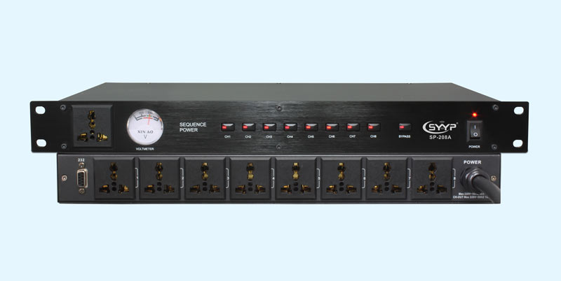 時序器功能介紹: 本產品適合于音響工程、電視廣播系統、會議室及電力設施場合需要按次序電源分配系統的場合。 電源時序器能夠按照前級到后級逐個順序啟動設備,有效統一管理控制各類用電設備,避免人為失誤操作,從而確保用電系統的穩定性和操作的簡便性。 本廠生產的電源時序器采用高純度鱗銅萬能插座,耐磨導電性強,而不采用雜質較多的黃銅,采用大品牌12V電流繼電器30A/250V,名牌大廠繼電器的選用,加上可靠的滅弧電路,令到繼電器的觸點溫升特別小,壽命長,整個系統非常可靠。3芯*6平方3C認證專業電纜。每一通道能受得起AC220V,13-20A電流,線路板采用雙面板SMT貼片技術2安銅高精密度板材制作。每一臺電源時序器都能受得起4-8臺,600-2000W專業功放,整機正常使用3000-5000W功率。 時序器參數: 1、 輸入電源:交流110V~220V 50Hz~60Hz 2、 控制電量:每路最大輸出電流30A 3、 額定輸出電壓:交流220V/50Hz 4、 可控制電源:8路 5、 不可控制電源:1路 6、 每路動作延時時間: 默認1.5秒(1-4.5S可調) 7、 電源開關控制電源