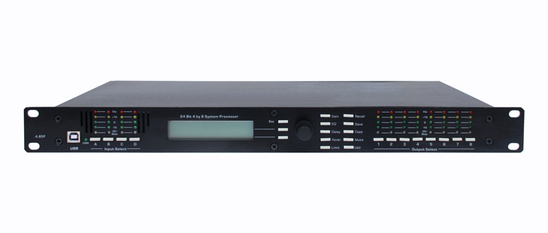 在音頻路由與控制處理方面非常的直觀。 4.8SP采用先進的高性能DSP處理器,輸入采用24 bit,48kHz的AKM A / D轉換器。數字處理包括:增益、極性轉換、參量均衡器、棚架濾波器、時間延時、分頻功能、壓縮、限制和信號路由,D / A轉換器使用24位delta-sigma轉換器。 每路輸入可控制增益、延遲和六個濾波器(您所選擇的每一個參數,高或低棚架) 。
